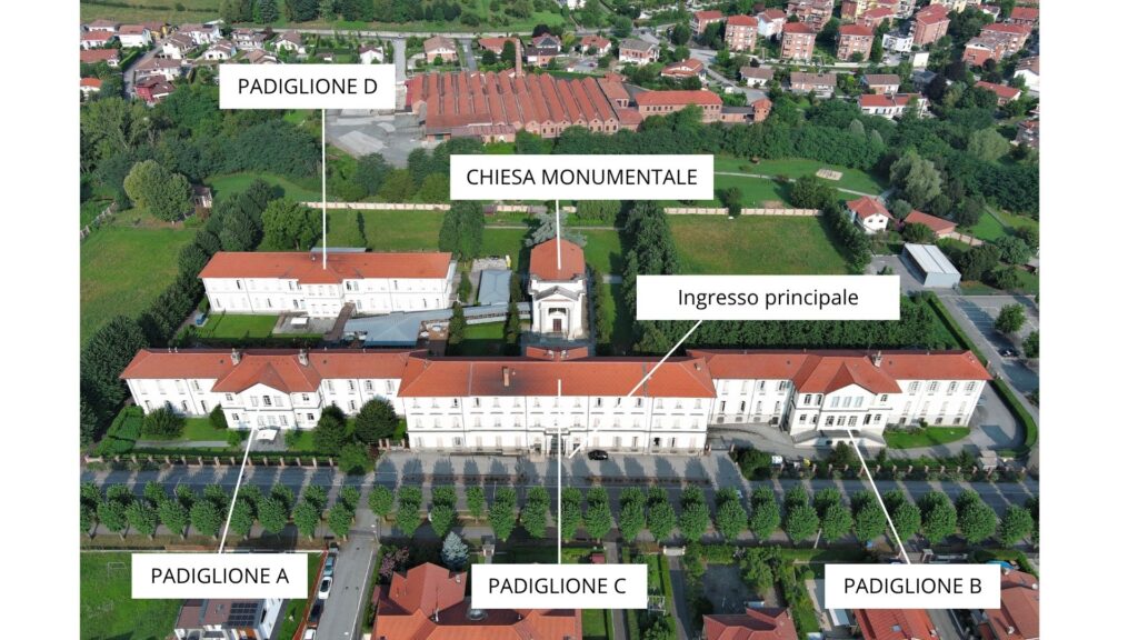 La struttura architettonica si sviluppa attraverso un edificio principale formato da quattro padiglioni: A, B, C e D.